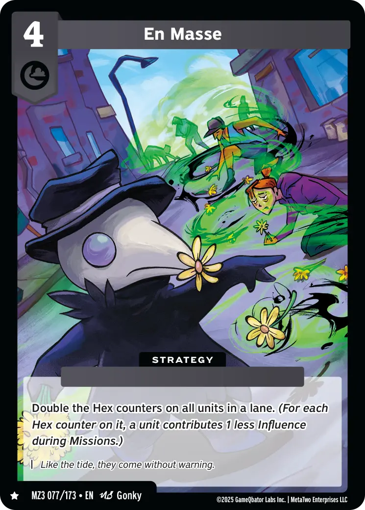 Double the Hex counters on all units in a lane. (For each Hex counter on it, a unit contributes 1 less Influence during Missions.)
